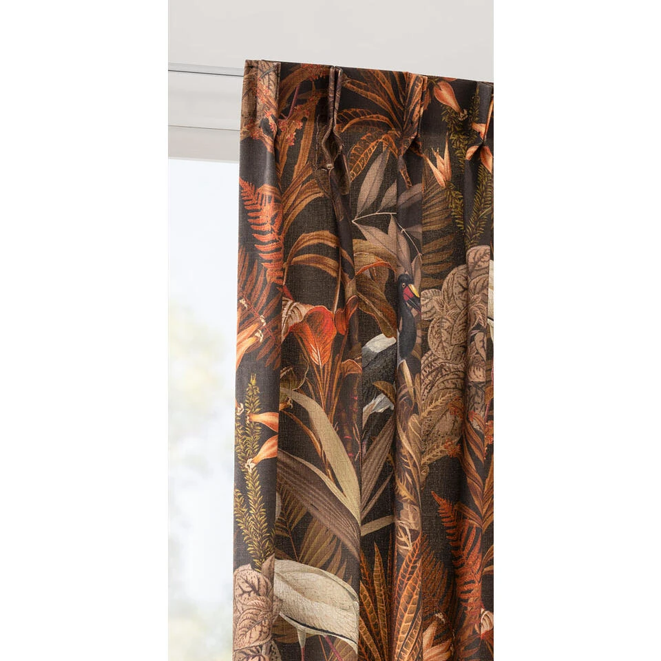 - Een gordijnstof met een tropisch patroon van bladeren en vogels