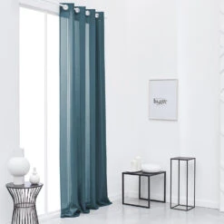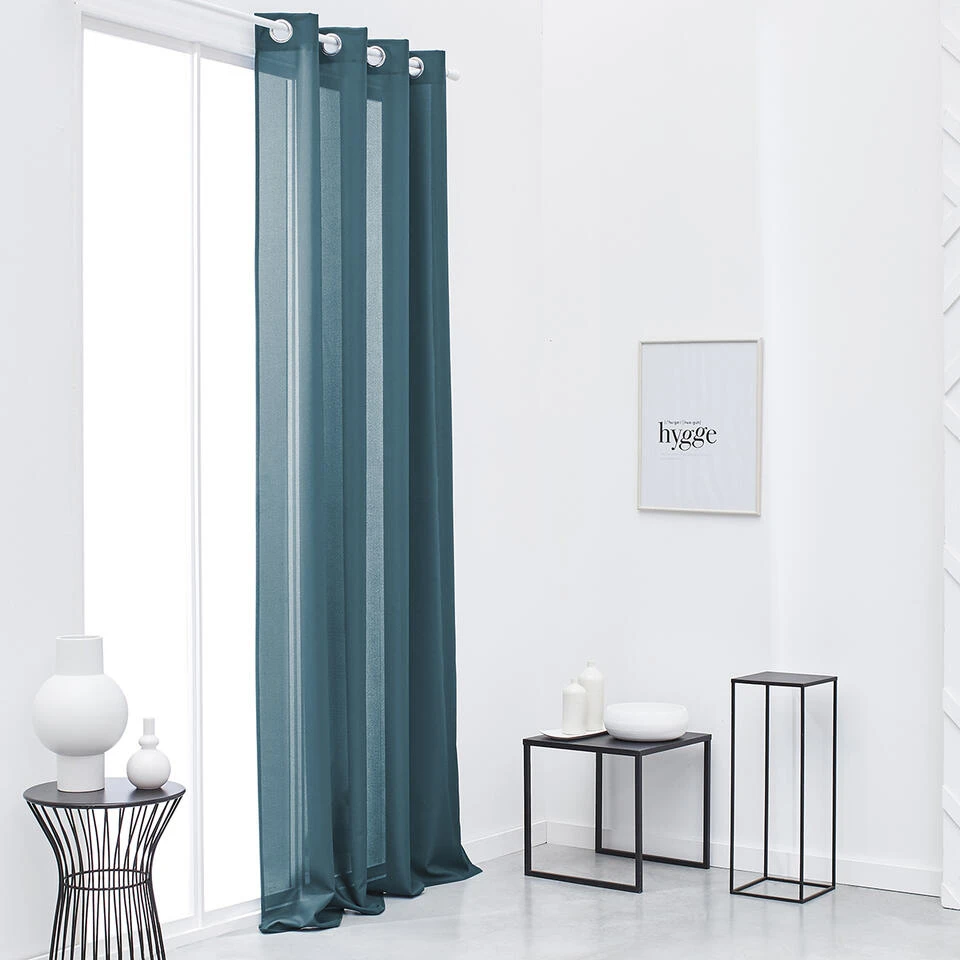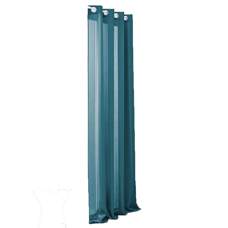 Het petrol blauwe gordijn van is volledig gemaakt van polyester. De bovenzijde is afgewerkt met metalen ringen. Hiermee kan het gordijn makkelijke worden opgehangen aan een houten of metalen roede. De raambekleding heeft een zicht werende werking. Privacy in je eigen woning is daarmee gegarandeerd.
