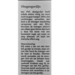 Het vliegengordijn Orchidea is een effectief en decoratief PVC vliegengordijn om vliegen en andere insecten te weren. Het vliegengordijn is gemaakt van hoogwaardig soft PVC en heeft daardoor een lange levensduur. Het vliegengordijn is gemakkelijk schoon te maken en indien nodig kun je deze zelf inkorten naar een voor jou gewenste lengte. Dit vliegengordijn wordt standaard kant-en-klaar geleverd inclusief een ophangsysteem.